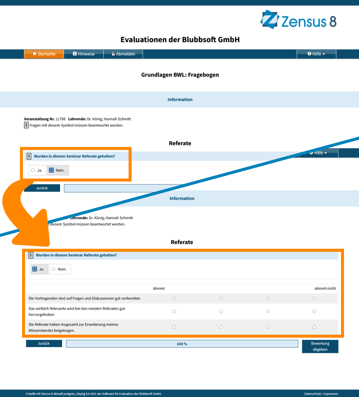 Die Studierenden sollen bei der Evaluation nur die zu ihrer Veranstaltung zutreffenden Frageblöcke sehen und beantworten.