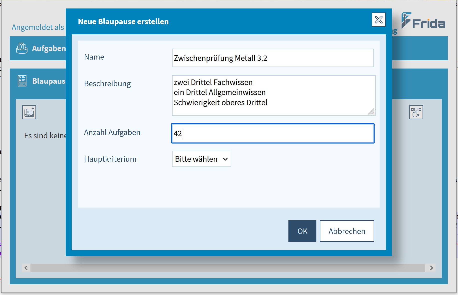 Mit Hilfe einer Blaupause in unserer Aufgabenverwaltung Frida können Sie automatisch Prüfungen erstellen. Sie legen dabei fest, welche Kriterien jeweils berücksichtigt werden sollen.